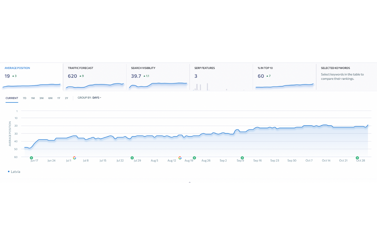 Ar 22 no 40 atslēgvārdiem mājaslapa atrodas Google meklēšanas rezultātu Top 10.